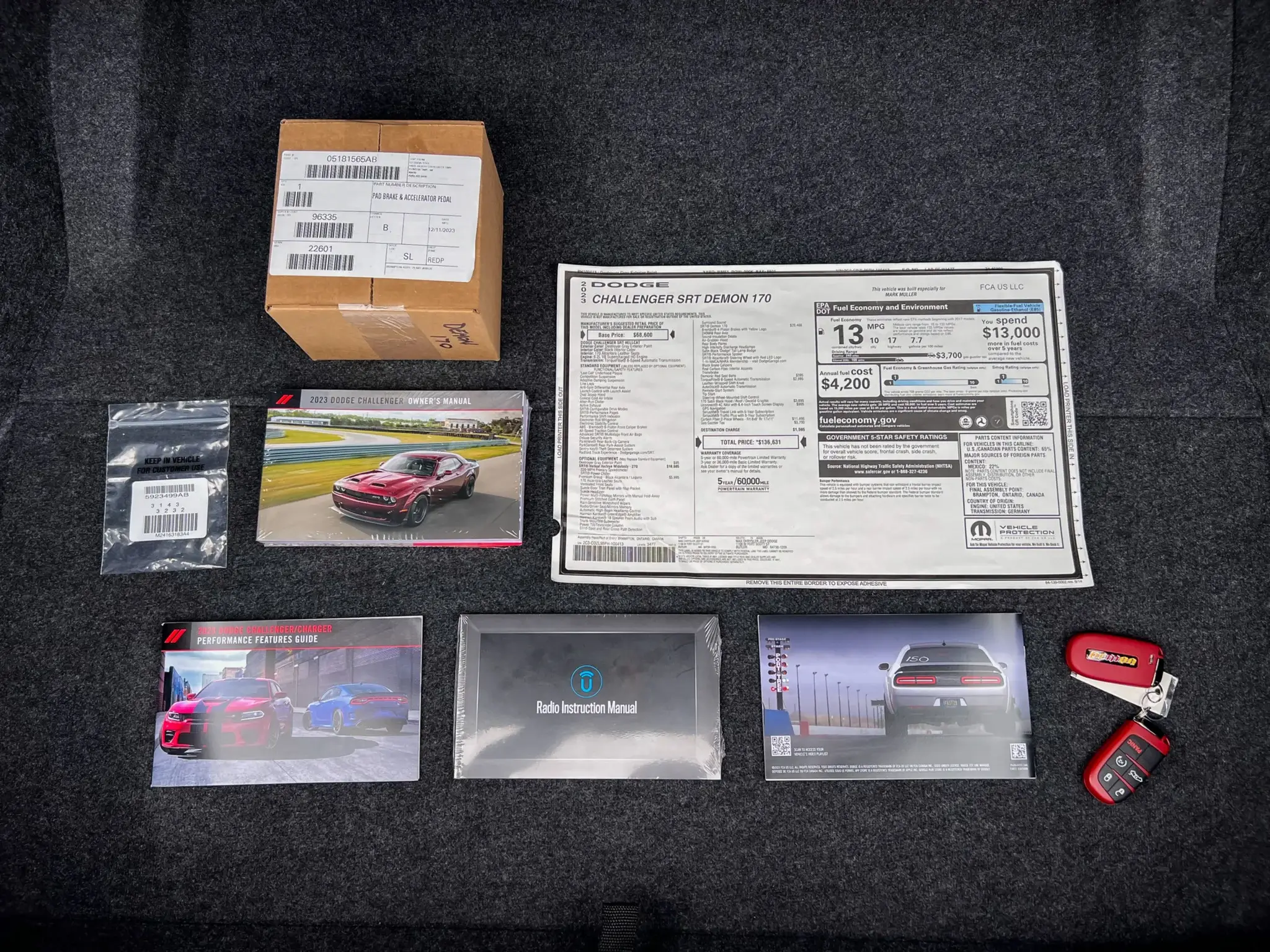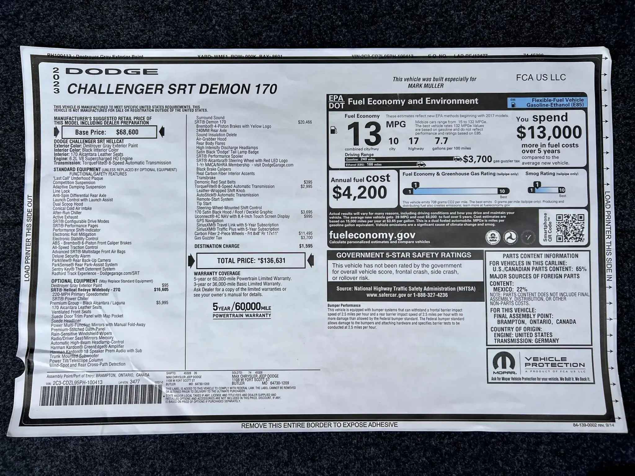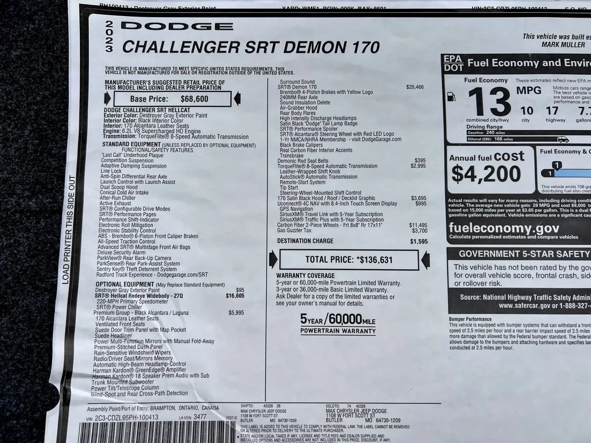 Part of the “Last Call” limited-edition series, the Dodge Challenger SRT Demon 170 debuted in 2023 as the fastest accelerating production car in the world featuring a 6.2-liter supercharged V8 that produces over 1,000 HP when fed with E85, a 170-proof ethanol fuel mixture. Based on the SRT Hellcat Redeye Widebody, the Demon 170 package commands an additional $20,465 on the window sticker including Brembo 4-piston brakes, a 240mm rear axle, a Transbrake, an Air-Grabber hood, an SRT performance spoiler, and carbon fiber interior accents. This example is one of a 3,300-unit planned production run and comes finished in Destroyer Gray over a Black interior. It is further equipped with desirable carbon fiber two-piece wheels, a TorqueFlite 8-speed automatic transmission, 170 Satin Black graphics, the Premium Group, and more.